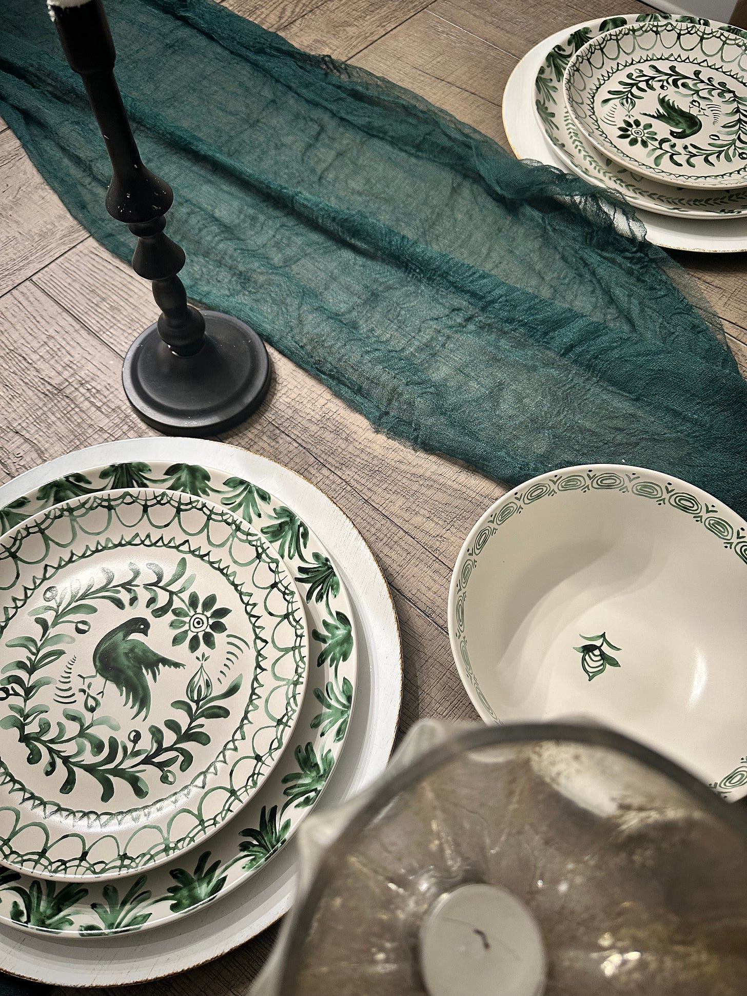 I’ll also be reusing this gorgeous sage/olive green plateware we bought last year that I’m still obsessed with. The goal is to add a new set each year, but it just didn’t happen this time, and that’s okay.